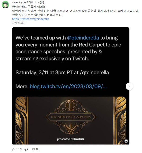 형 해외 스트리머 시상식 방송에 형 나온 거 봤어?