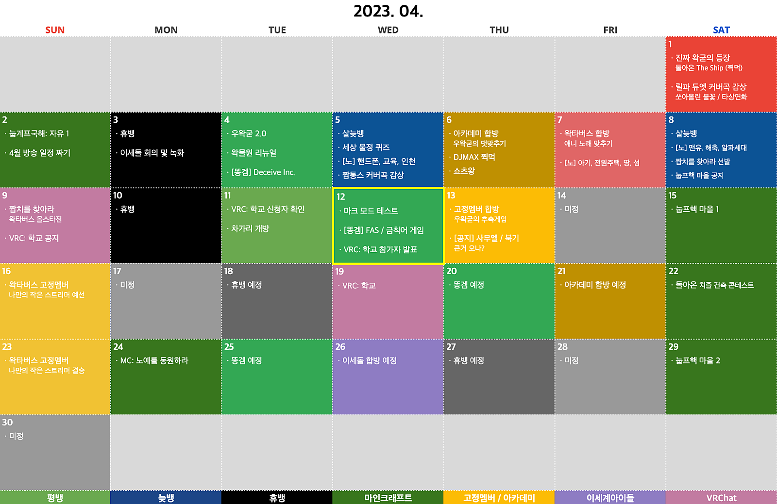 04월 13일 [다시보기] ① 고정멤버 합방: 우왁굳의 추측게임 / Infested ② 짬통스: 망령 아지트 공개 ③ [공지] 유니티 시네머신 스터디생 모집 / 제 7회 고정멤버 오디션 ④ [고놀] 히키킹 커버곡 예고편 ⑤ 2023년 방송 계획표 수정