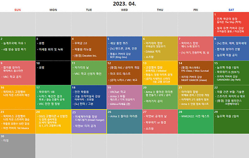 ① 이세계아이돌 합방: 드레드헝거 ② 익명W: 티저 공개 ③ 아르마3: 이름표 스크립트 테스트 ④ 4,5월 일정 잡기 ⑤ WWE2K22 컨텐츠 구상