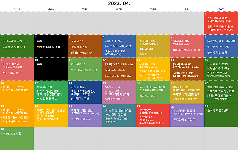 ① 이세계아이돌 합방: 드레드헝거 ② 익명W: 티저 공개 ③ 아르마3: 이름표 스크립트 테스트 ④ 4,5월 일정 잡기 ⑤ WWE2K22 컨텐츠 구상