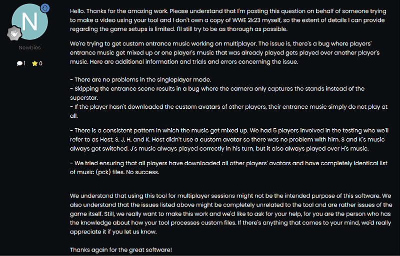 안녕하세요. 멋진 작업을 해주셔서 감사합니다. 이 질문은 당신의 툴을 사용하여 영상을 제작하려는 누군가를 대신하여 드리는 것이며, 저 자신은 WWE 2k23을 보유하고 있지 않은 관계로 게임 설정과 관련하여 제공할 수 있는 세부 정보가 제한되어 있다는 점을 양해해 주시기 바랍니다. 그래도 최대한 자세히 설명하도록 노력하겠습니다.