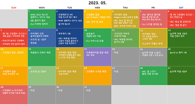 ① 고정멤버 합방: Jack of Hearts / 위험한 초대 ② WWE 2K23: 입장 영상 삽입하기 ③ VRC: 잔잔 맵 탐방 ④ 고멤 소개팅 컨텐츠 일정