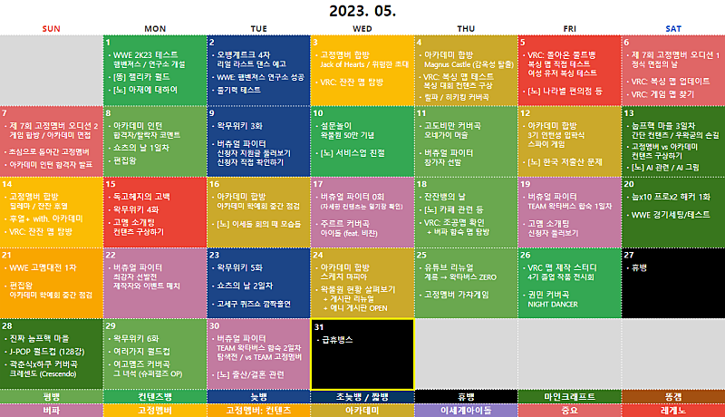 ① 고정멤버 합방: Jack of Hearts / 위험한 초대 ② WWE 2K23: 입장 영상 삽입하기 ③ VRC: 잔잔 맵 탐방 ④ 고멤 소개팅 컨텐츠 일정