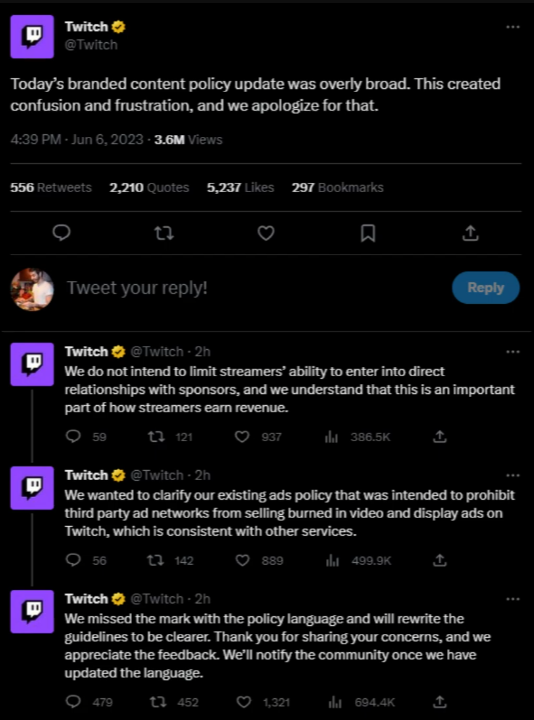 트위치는 이 상황에 대하여 단순한 오해라고 변명하며 공지에 쓰인 언어가 광범위하여 사람들이 착각에 빠졌다고 주장.