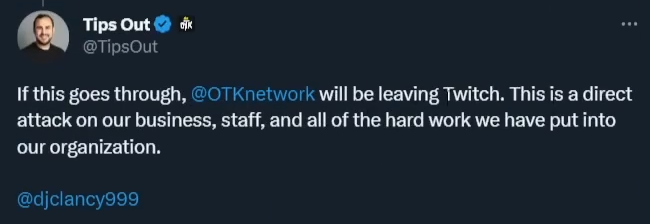 "이 규정이 통과된다면 OTK 네트워크는 트위치를 떠나겠습니다. 이것은 저희 기업, 직원, 그리고 저희가 저희의 단체에 쏟은 모든 노력에 대한 트위치의 직접적인 공격입니다."