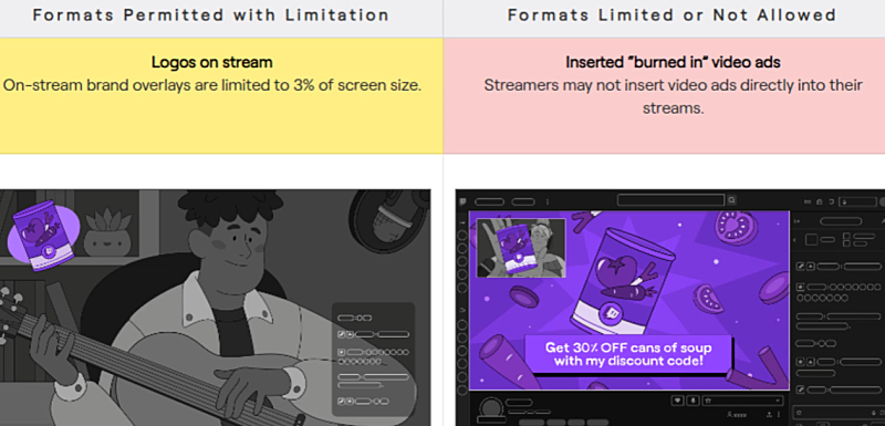 좌) 트위치 방송 중 타 브랜드 로고 이미지 등으로 광고하는 것은 화면 3% 이하에 해당하는 공간만을 차지하게끔만 제한적으로 가능