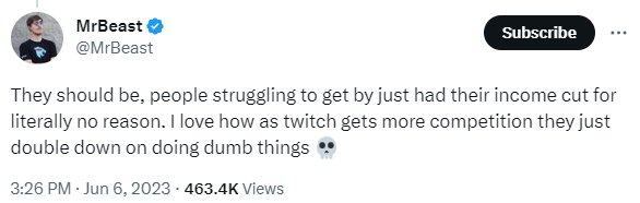 "당연히 화내야지, 이 일에 생존이 걸려있는 사람들 수입이 사실상 이유없이 떼인건데. 트위치는 경쟁이 심해질수록 멍청한 짓들만 계속하는 게 참 마음에 들어 💀"