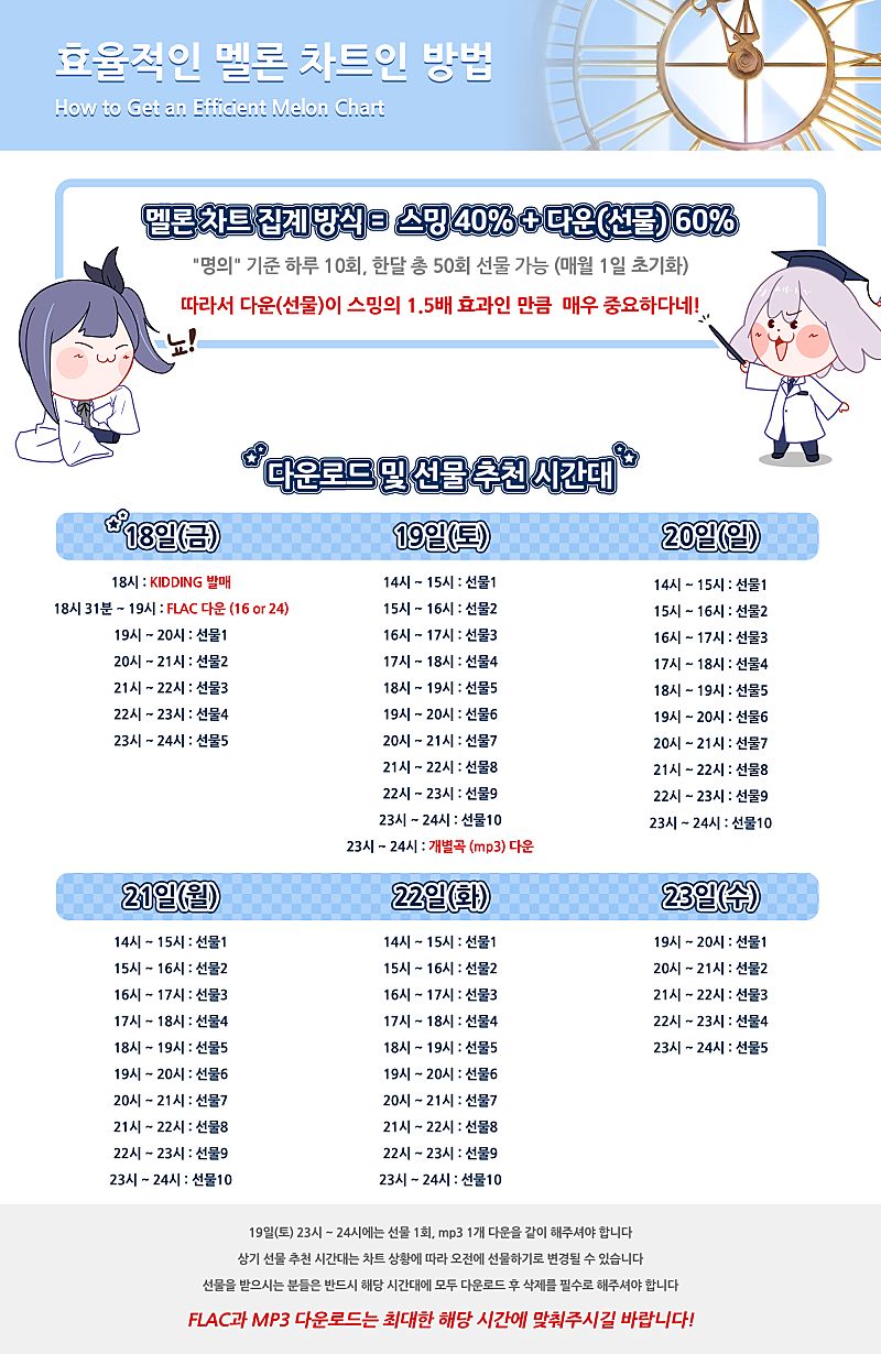 ㄴ 선물하기 시스템이 차트 반영되는 시점이 선물했을 당시인지, 혹은 다운로드한 시점인지 현재 명확한 결론이 나지 않은 상태입니다. 따라서 팬치 이파리분들의 소중한 돈이 헛되이 쓰이지 않도록, 귀찮으시겠지만 안전빵으로 다운로드 후 삭제를 부탁드립니다.