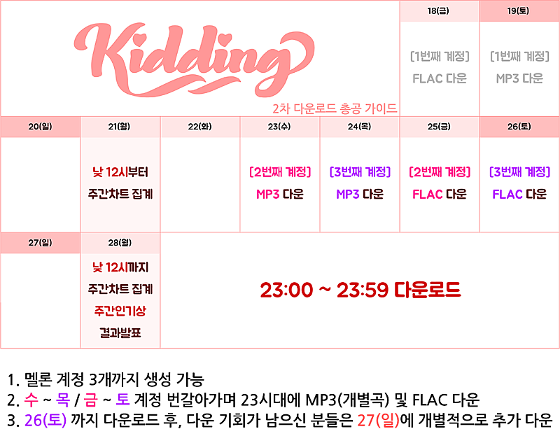 ㄴ 지난 여러번의 총공 진행 시 확인된 사항입니다. 다운로드를 안하면 차트에 집계되는 스밍이 되지 않기에 반드시 삭제해야겠지만, 반대로 삭제했다가 키딩이 빠져버리는 사례가 발생할 수도 있습니다. 따라서 불편하시겠지만 "스밍을 돌리지 않는 기기에서 다운로드 하는 경우가 아니라면, 꼭 삭제 후 재생목록에 키딩이 있는지 확인" 부탁드립니다.