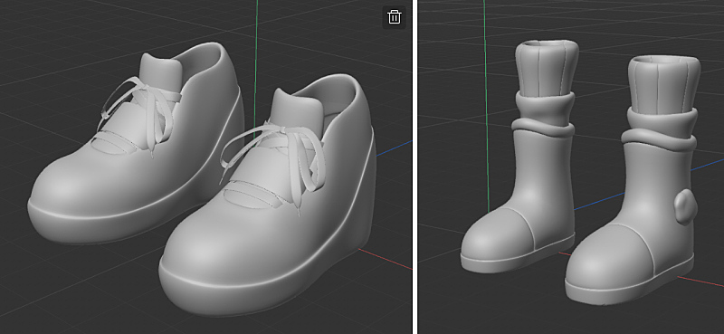 이렇게 일상복 신발 5켤레, 마법소녀 신발 6켤레 모델링을 진행 하였고 아이네님, 징버거님, 주르르님, 비챤님 보석 모델링 및 텍스처링, 그리고 소품들도 제작 했습니다 (예시: 세구님이 받는 붕어빵 봉투)