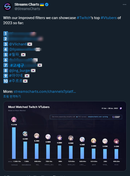 올해 2023년 상반기 트위치 버튜버 뷰어쉽 순위입니다.