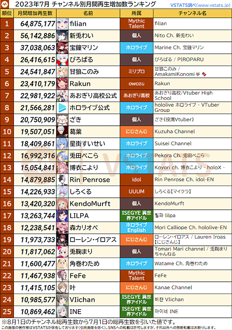 2023년 7월 버튜버 월간 유튜브 조회수 증가량 랭킹