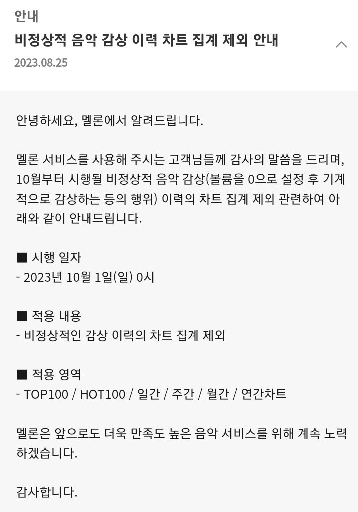 형 10월 1일부터 멜론 음소거 스밍 집계에서 제외한다고 함