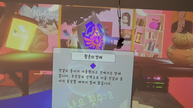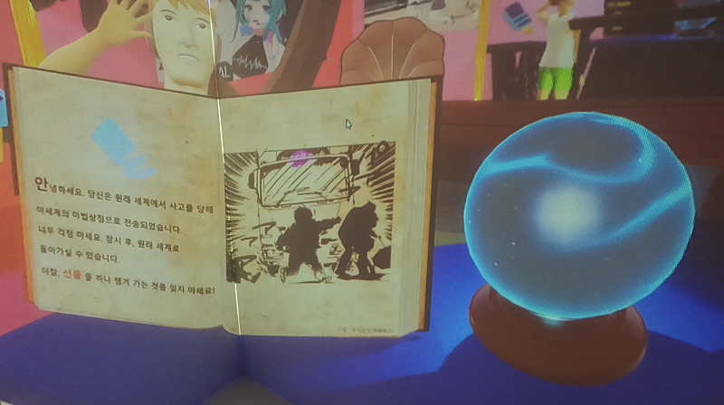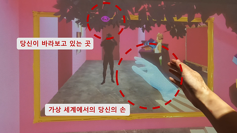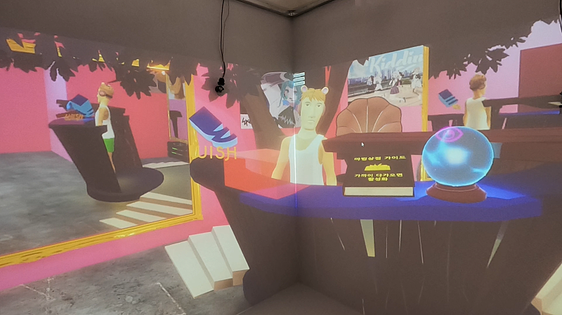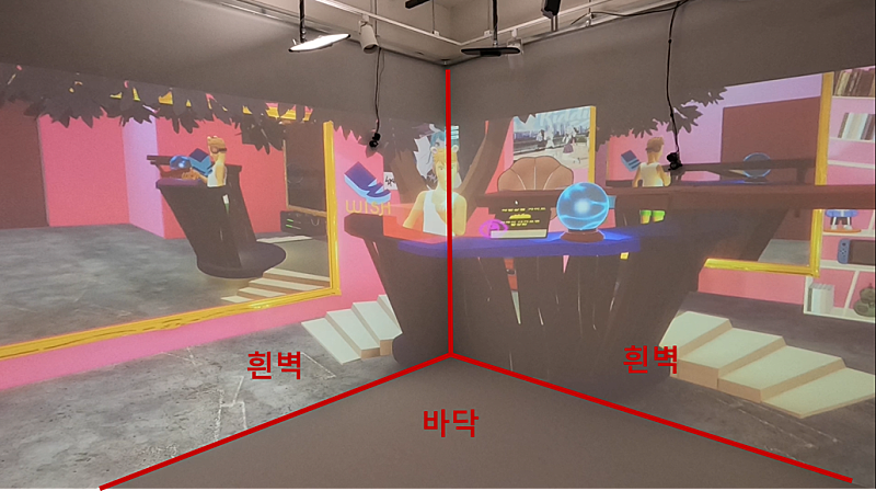 이 공간에 들어가면 벽 너머가 입체로 보여. 마치 벽이 창문이 된 것처럼 컨텐츠가 "안쪽으로 들어가 보이고", "바깥으로 튀어 나와 보이게" 돼. 이걸 VR이라고 하던 홀로그램이라고 하던 마음대로 불러도 좋아. 정확히는 Augmented Reality나 Mixed Reality로 봐야 할 것 같아.
