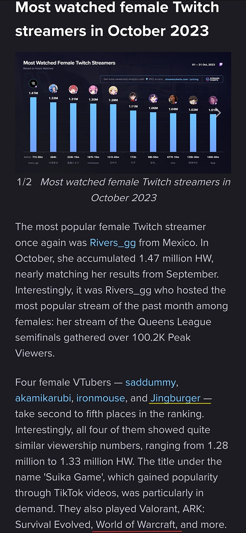2023년 10월 트위치에서 가장 많이 시청한 여자 스트리머