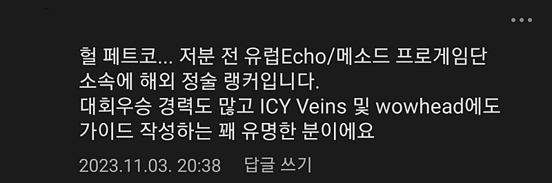 대회우승 경력도 많고 ICY Veins 및 wowhead에도 가이드 작성하는 꽤 유명한 분이에요