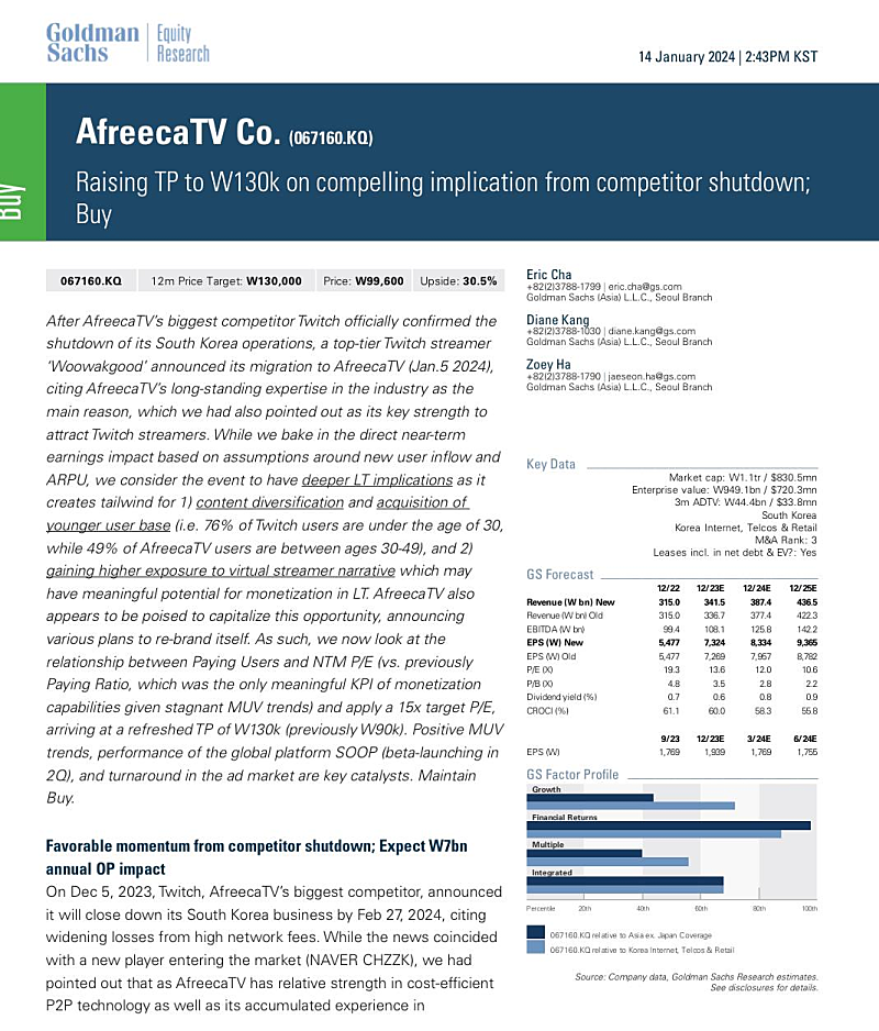 트위치 탑티어 스트리머 '우왁굳'이 아프리카TV로의 이적 - 골드만삭스