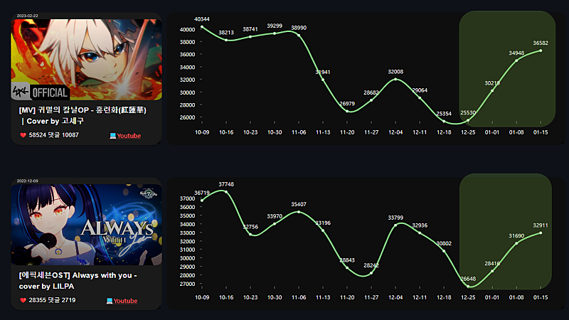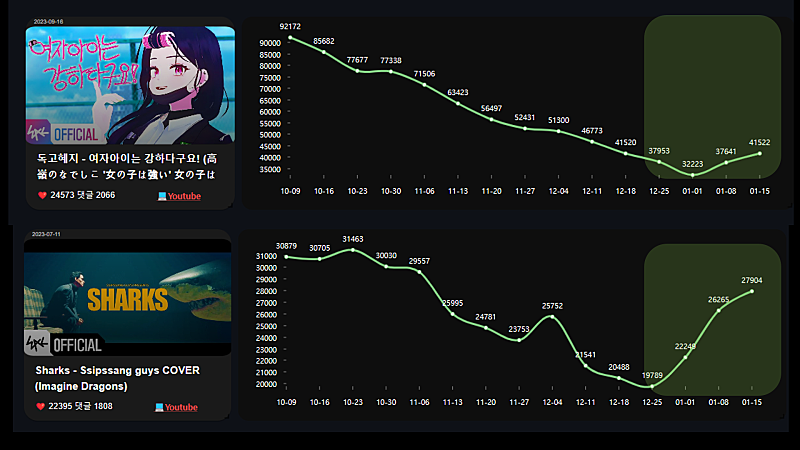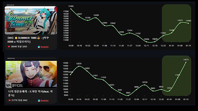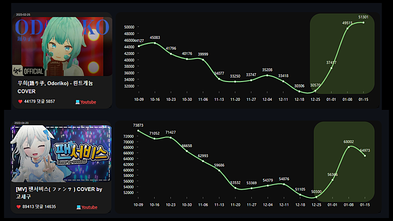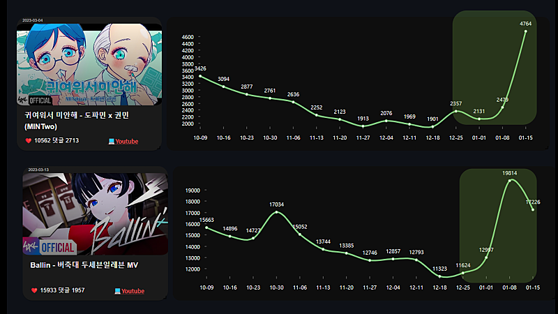 형 왁뮤 중단후 데이터 반영이 신기해서 주간별로 시각화 해봤어 ㅋㅋ