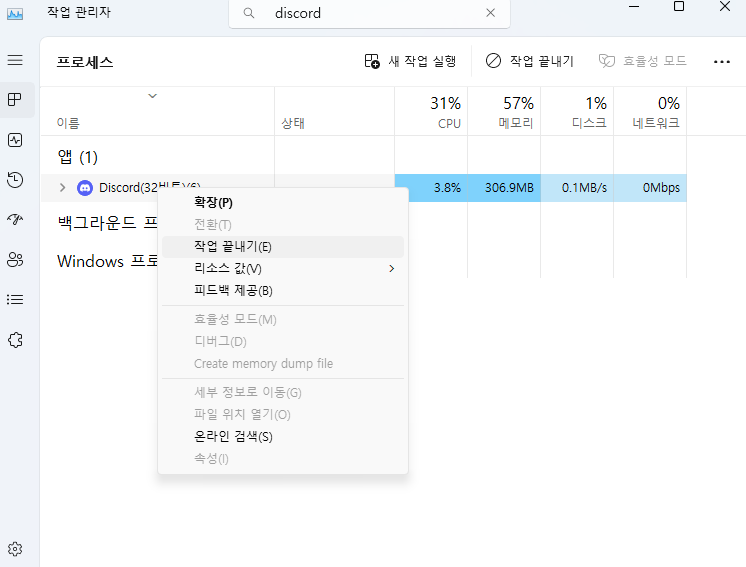 + 이때 자동으로 실행되는 디스코드를 X를 눌러 끄면안돼고 작업관리자를 이용해 작업 끝내기를 클릭하여 종료 시켜야한다.