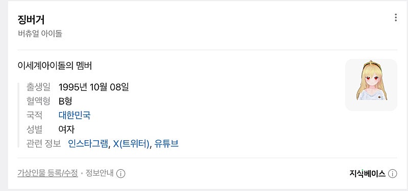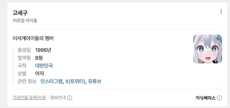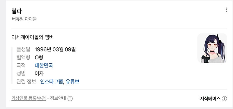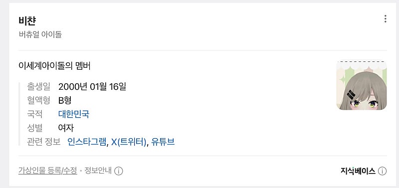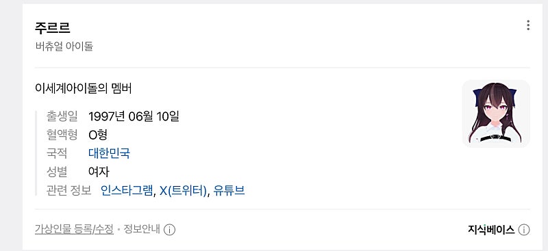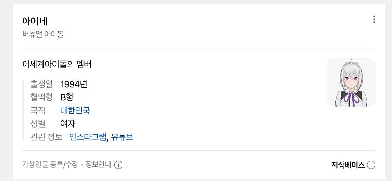 네이버 가상인물 같은걸로 등재되신거 같은데 직업은 '버츄얼 아이돌'이고 설명에 '이세계아이돌의 멤버'라고 써져있어!