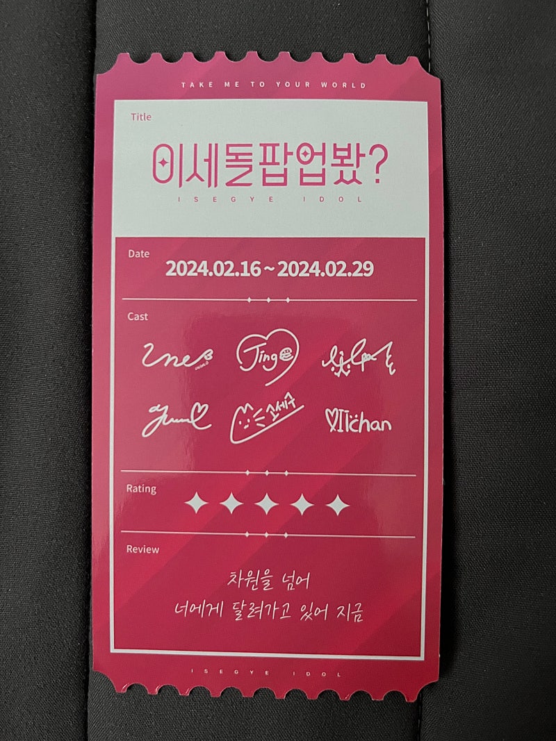 입구에서 받게되는 티켓입니다. 이걸 들고 포토존에서 들고 사진 많이 찍었는데 혼자 오신 분들이 많아서 스태프분 . 이파리분들이 많이 도와주셨어요