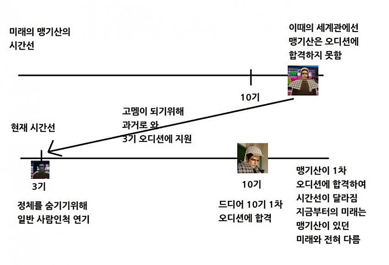 2. 자신이 왔던 미래에선 고멤이 된 적이 없었는데 이번에 인턴 합격하면서 미래가 비틀림. 그래서 이미 자기가 알던 미래의 지식은 소용없다고 함. (주식)