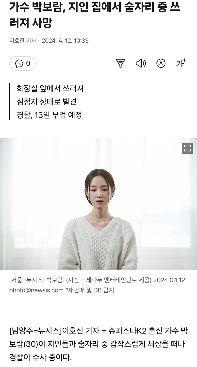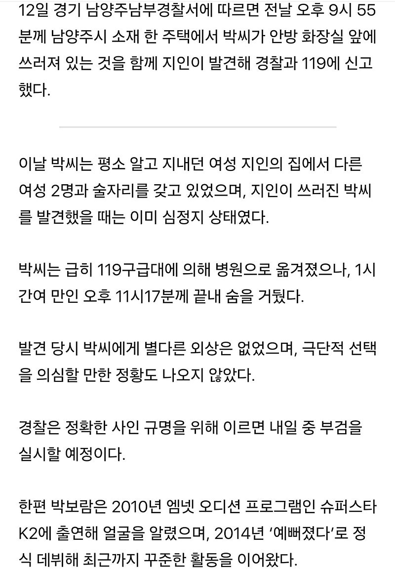 가수 박보람 사망원인....