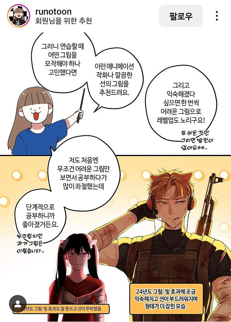 Instagram의 르노(Runo)| 인스타툰님 : "309화 그림 똥손은 이유가 뭘까(4) 다들 그림 공부를 해보고 싶은데 뭘 그려야 할지 고민하더라구요. 특히나 그림 공부법으로 많이 사용하는 모작을 할 그림을요🥸 그래서 이와 관련된 추천과 함께 자세한 설명을 정리해봤습니다. 너무 간단한 결론일 수 있지만 이유를 알고 이해해야 다음 단계로 나갈 수 있으니까요:)🙂↕️ 많은 초보분들에게 도움이 되길 바라며 또 열심히 저도 공부하고 나아가서 더 많은 걸 알려드리겠습니다!! 모두 함께 즐거운 그림라이프 즐겨봐요! #미술학원#르노툰"