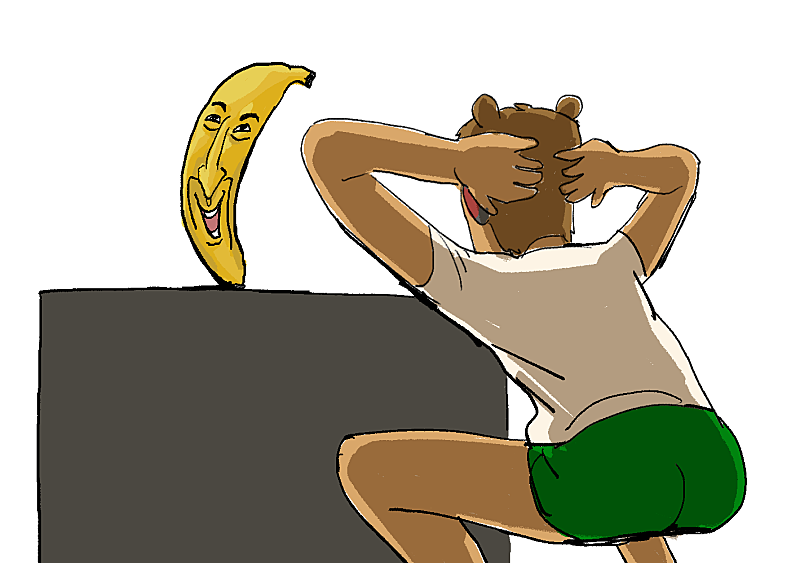 바나나를 세우는 데 성공한 우왁굳을 보는 바나나