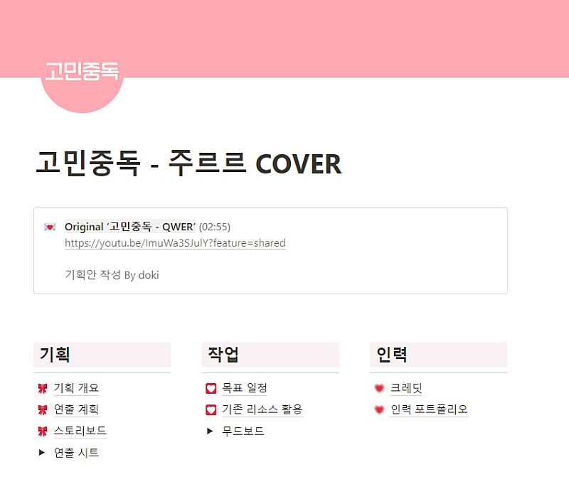 안녕하세요. 이세계 아이돌 주르르님의 [고민중독] Cover M/V 제작 프로젝트에서 감독, 팀장, PM, 디자인, 기획안 디벨롭, 프리비즈 영상 편집, 스토리보드 시트 정리, 연출 숟가락, 티저(였던 것) 제작 등..의 작업을 맡은 doki입니다.
