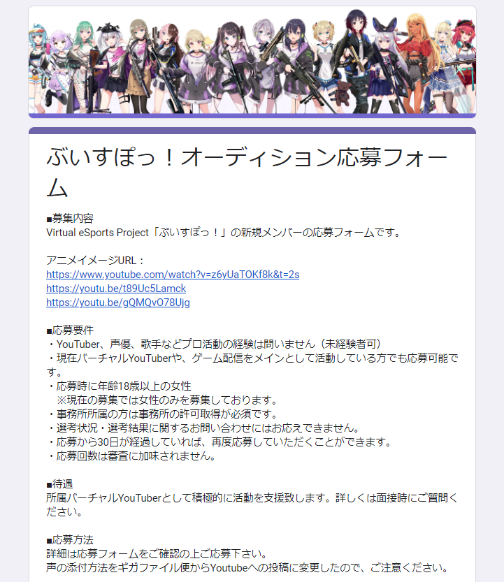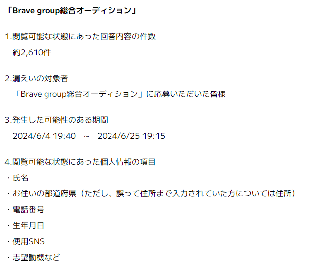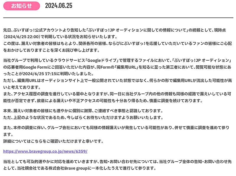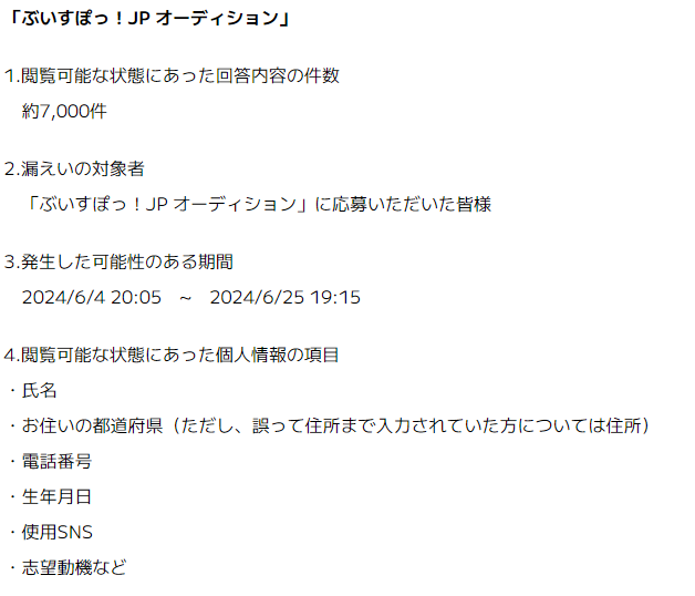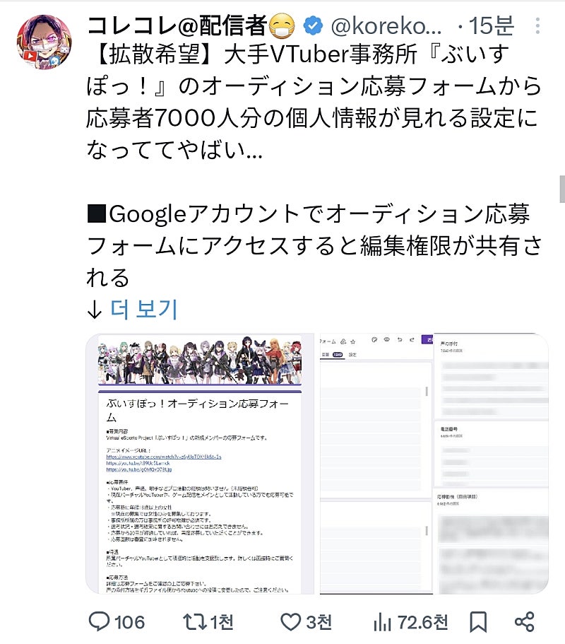 확산희망】대기업 VTuber 사무소『브이스포!의 오디션 지원서에서 지원자 7000명분의 개인정보가 볼 수 있도록 설정되어 있어 위험...
