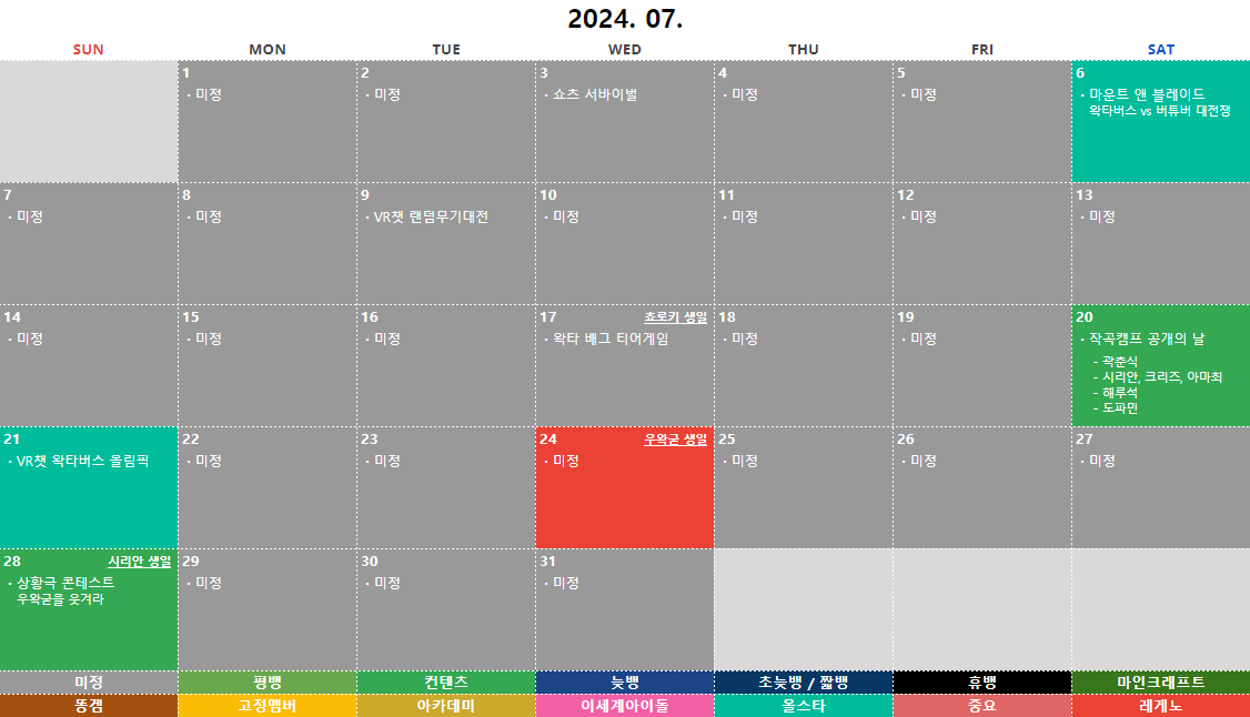 2024년 07월 ① 마운트 앤 블레이드: 왁타버스 vs 버튜버 대전쟁 ② VR챗 왁타버스 올림픽 ③ 상황극 콘테스트: 우왁굳을 웃겨라