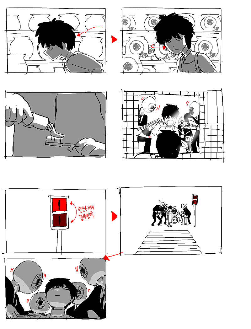 자신을 괴롭히는 눈알들을 참교육하는 '망상'을 하는 장면을 전담해서 작업했습니다
