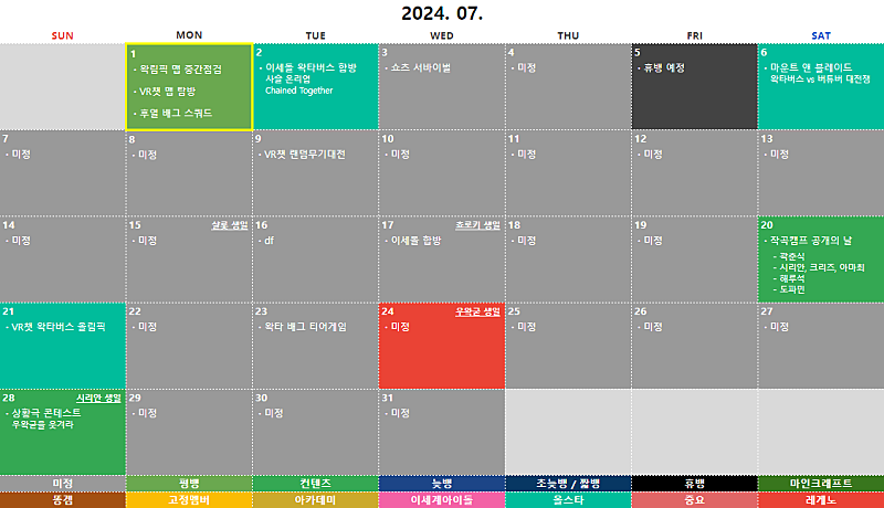 2024년 07월 ① 마운트 앤 블레이드: 왁타버스 vs 버튜버 대전쟁 ② VR챗 왁타버스 올림픽 ③ 상황극 콘테스트: 우왁굳을 웃겨라