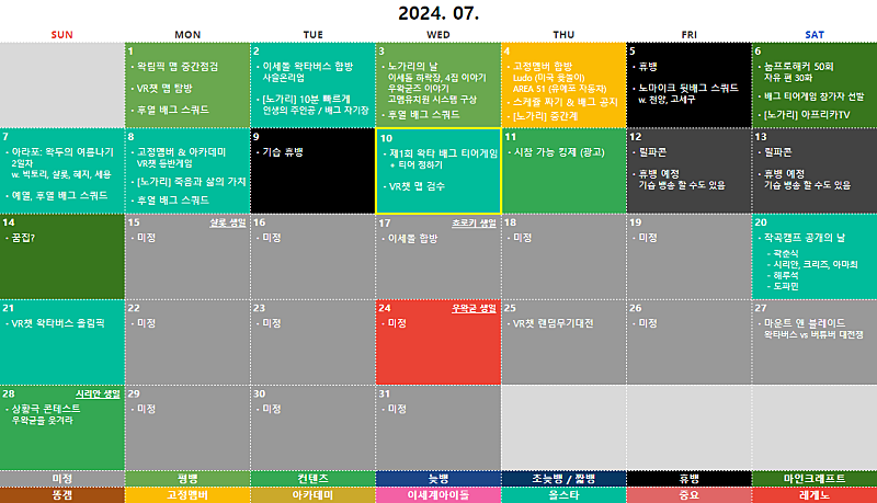 2024년 07월 ① 왁타버스 배그 배치고사 ② VR챗 왁타버스 올림픽 ③ 상황극 콘테스트: 우왁굳을 웃겨라 ④ 아라포, 작캠, 꿈집