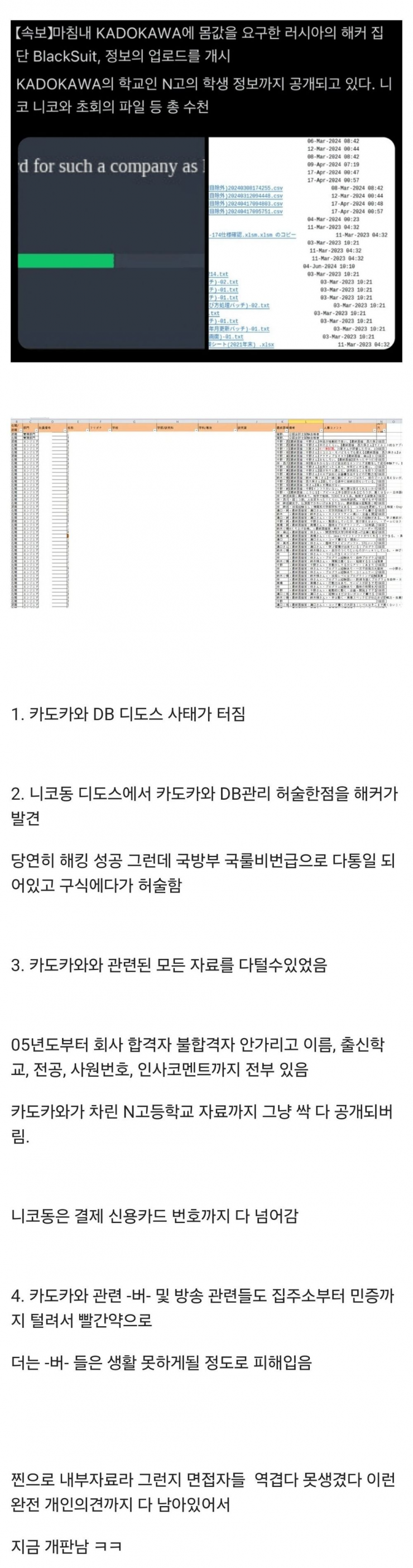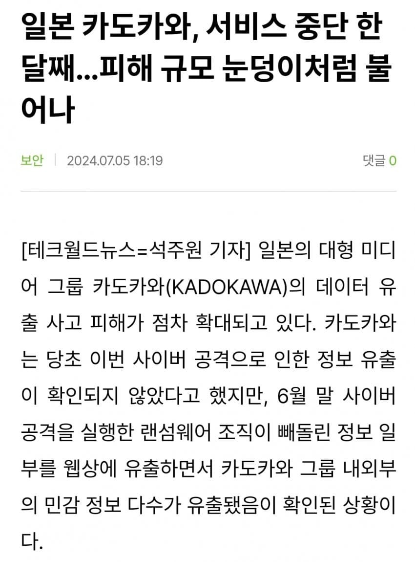 요때 아래에 해커들이 카도카와 협박중이라고 했던거 있었는데 그게 터졌나보네요