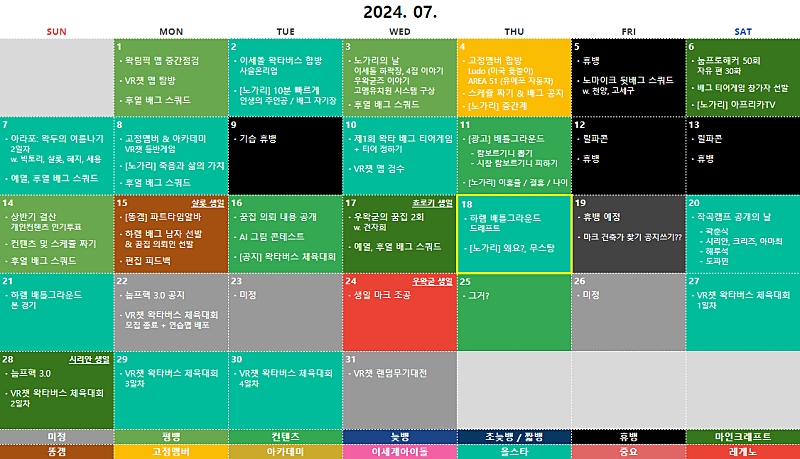 2024년 07월 ① 왁타버스 배그 배치고사 ② VR챗 왁타버스 올림픽 ③ 상황극 콘테스트: 우왁굳을 웃겨라 ④ 아라포, 작캠, 꿈집