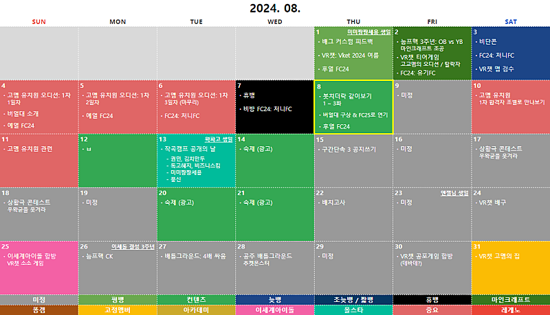 2024년 08월 ① 고멤 유치원 오디션 (공지) ② 우왁굳의 구간단속 3 ③ 배틀그라운드: 4배 싸움 ④ 공주 배그: 추켓몬스터 (클립)