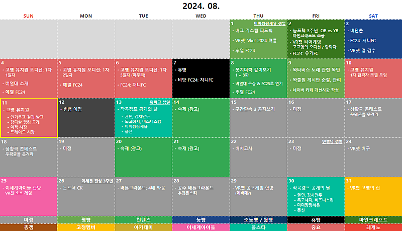 2024년 08월 ① 고멤 유치원 오디션 (공지) ② 우왁굳의 구간단속 3 ③ 배틀그라운드: 4배 싸움 ④ 공주 배그: 추켓몬스터 (클립)