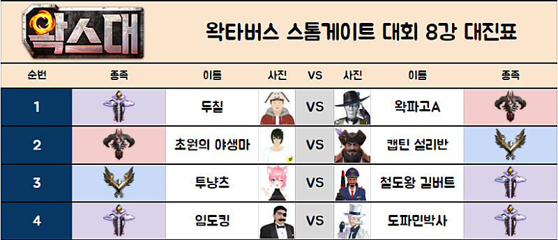 맵 : 8강부터는 모든 경기 시작전 우왁굳이 룰렛으로 맵을 정해드립니다.