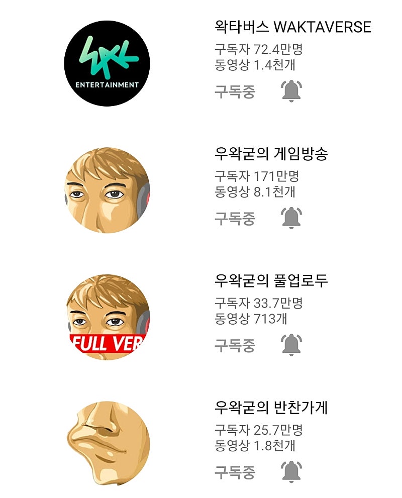 메튜브(2014.11.7~2019.12.19)-왁카데미(2019.12.19~2020.7.5)-풀업로두(2020.7.5~2021.9.13)-왁타버스(2021.9.13~현재)