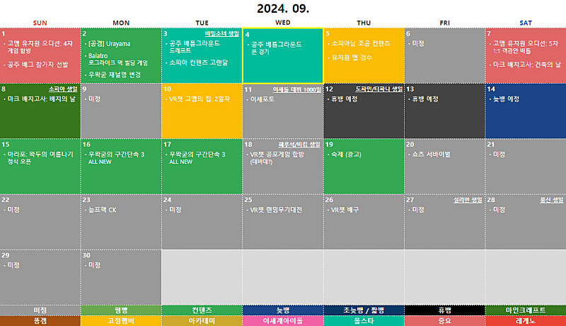 매달 정기 컨텐츠 ① 마크 눕프로해커 ② 마크 꿈집 ③ 왁타버스 배그 티어대전 ④ 아라포: 왁두의 여름나기