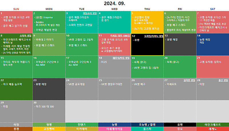 매달 정기 컨텐츠 ① 마크 눕프로해커 ② 마크 꿈집 ③ 왁타버스 배그 티어대전 ④ 아라포: 왁두의 여름나기