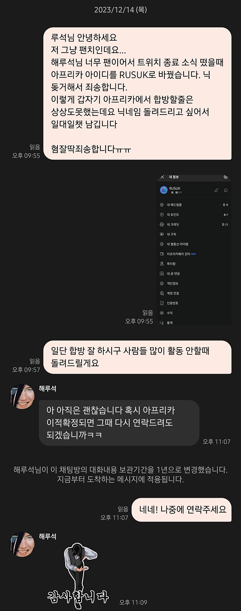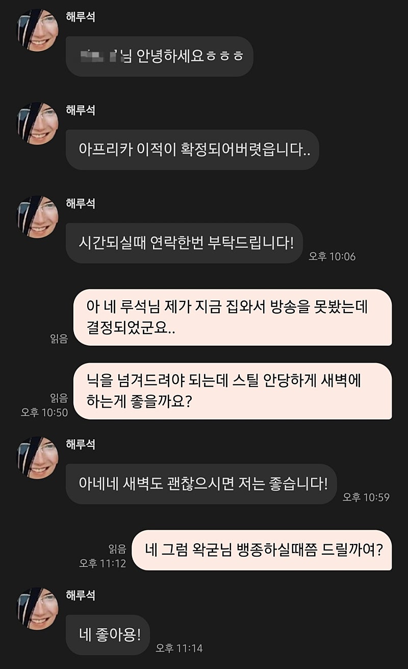 다행히 루석님께서 괜찮다 하시며 아프리카 이적 확정되면 연락주신다고 하셧습니다 (자비로운 대상현)