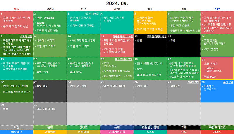 매달 정기 컨텐츠 ① 마크 눕프로해커 ② 마크 꿈집 ③ 왁타버스 배그 티어대전 ④ 아라포: 왁두의 여름나기