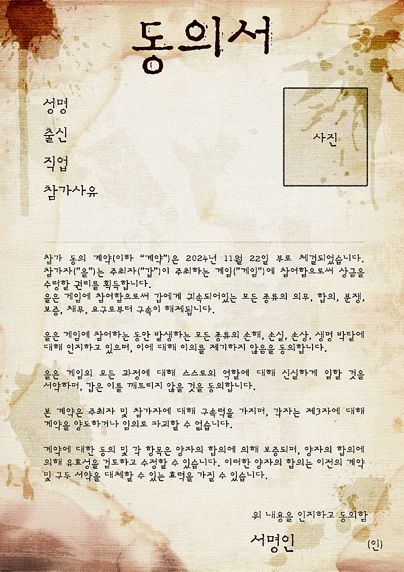 - 서명 : 참가자는 본 계약에 동의한다면 서명해주시길 바랍니다.