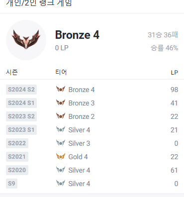 탑레는 골드 4 , 현재는 브론즈4 입니다!