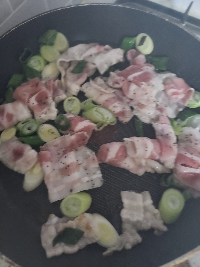 파가 기름을 먹고 외곽부분이 투명해질 때 쯤 고기를 넣습니다.
