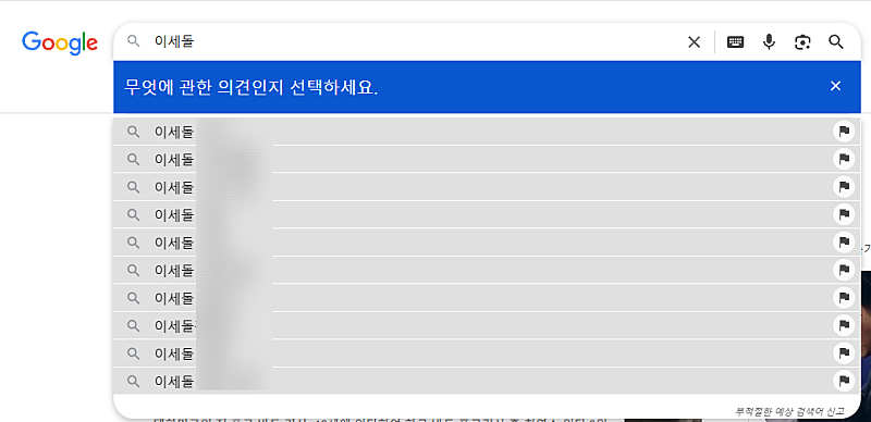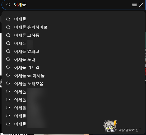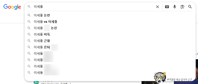그리고 '이세돌' 뿐 만 아니라 '이세' '이세계' '이세계아' 이세계아이' '이세돌(띄어쓰기 1번)'등 끊어 치기로 나오는 연관 검색어도 시간 많으시면 한번 씩 부탁 드립니다.