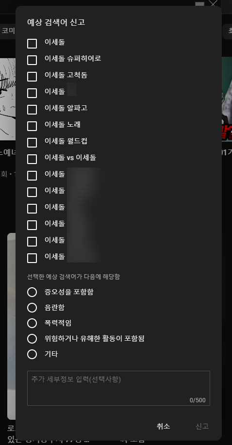 pc 유튜브 연관검색어 창 맨 밑에 예상검색어 신고누르면 신고할수 있어요.